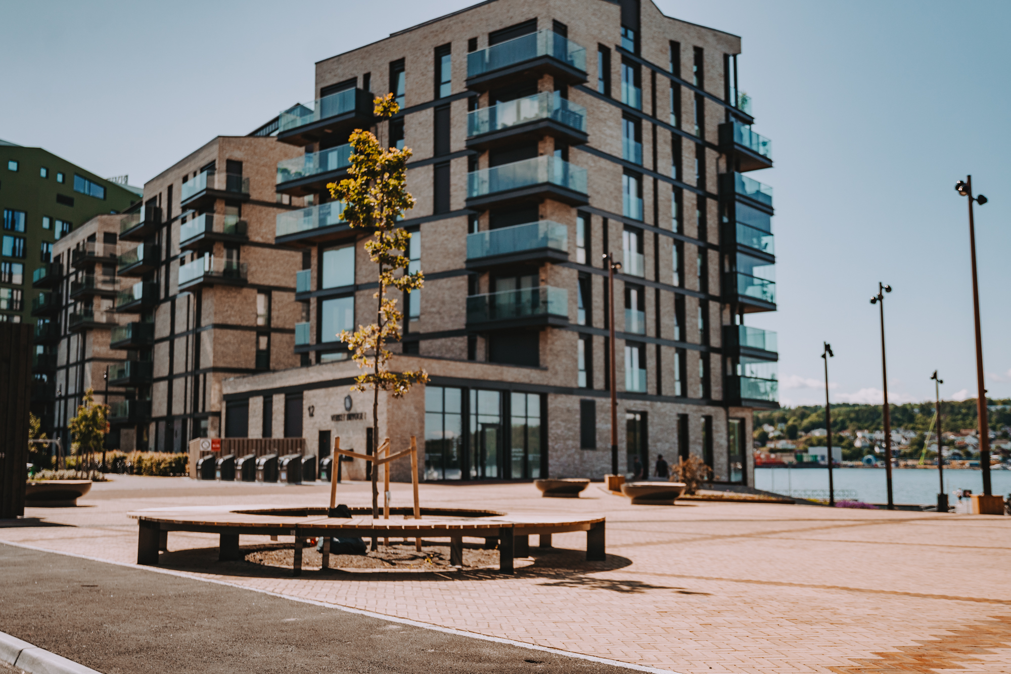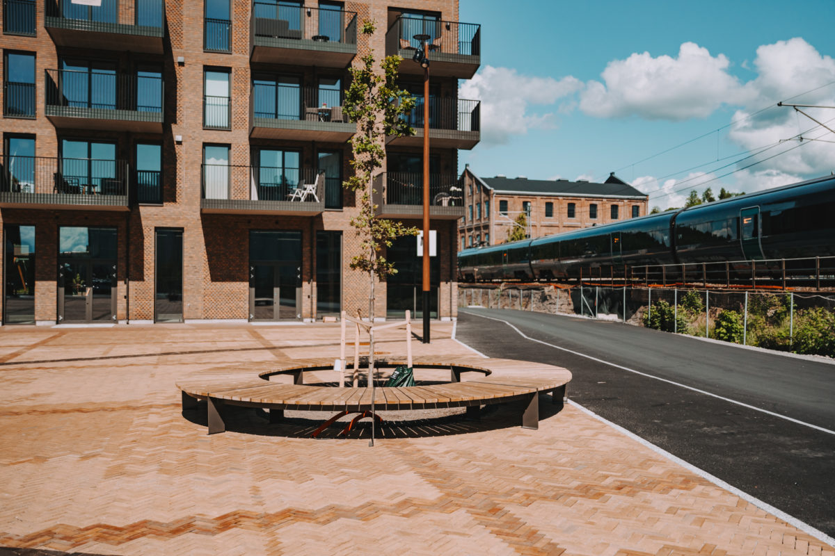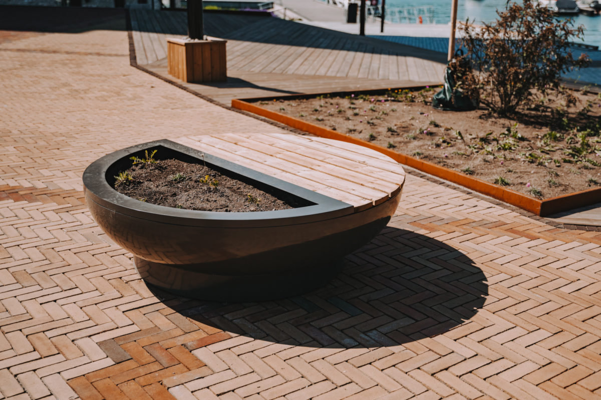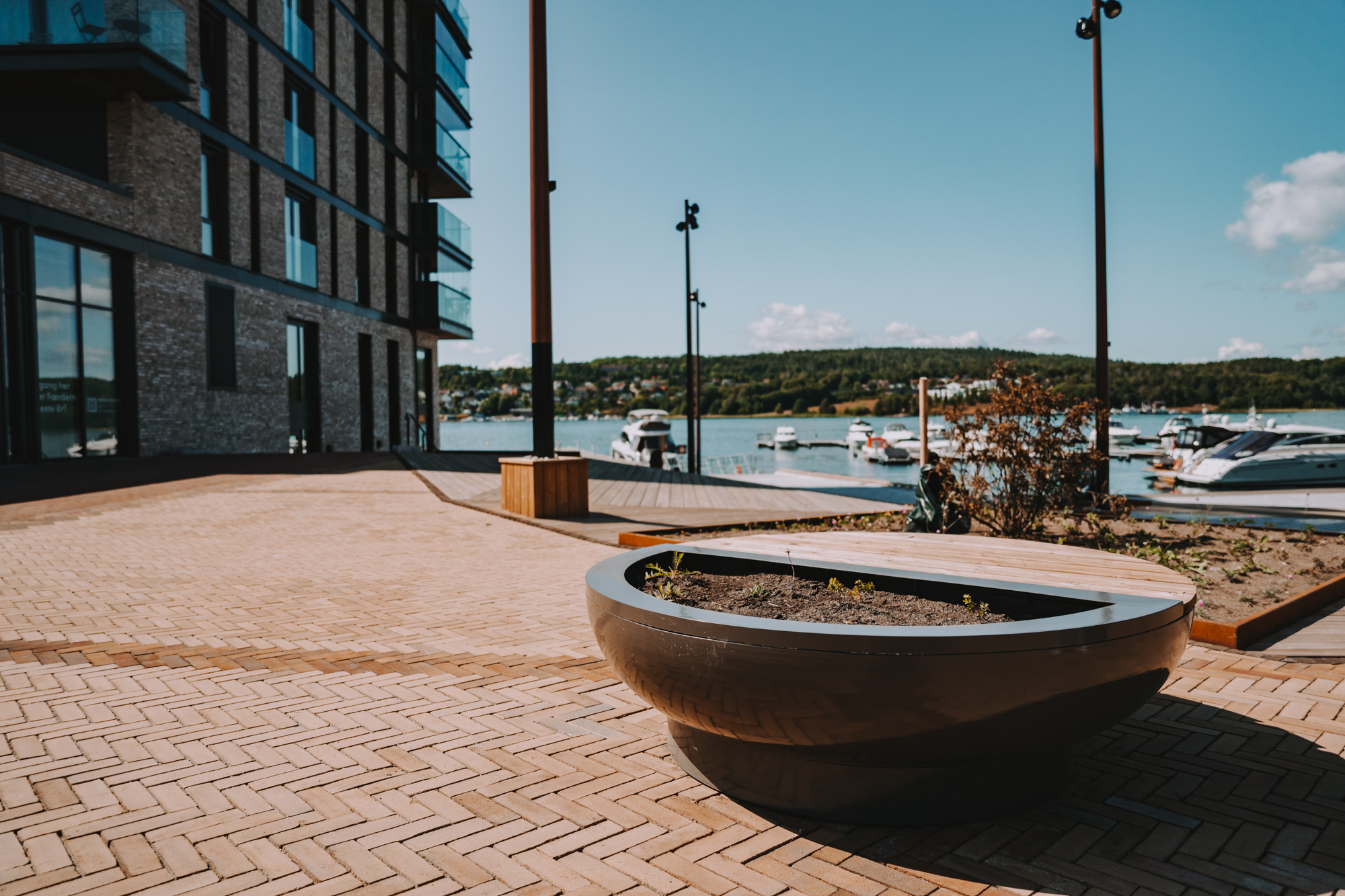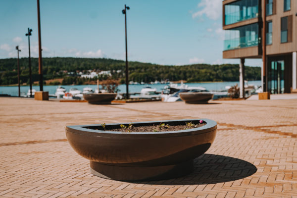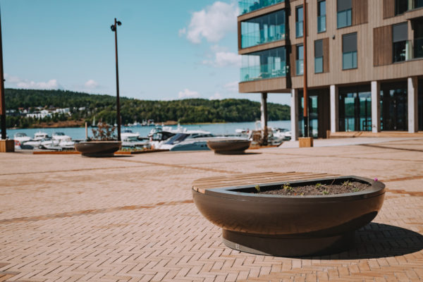 På Verket Brygge i Moss har Kobe levert spesialtilpassede møbler som bidrar til et innbydende og sosialt byrom ved vannkanten. Prosjektet omfatter en stor sirkelbenk med diameter Ø5000 mm, samt helt nye runde plantekasser med integrert sittefelt – TANK plantekasse med sittefelt. Denne kan også leveres kun som plantekasse eller heldekkende sittefelt.